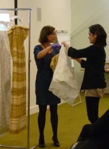 Last week my Vintage to Vogue course had a series of fascinating presentations from conservators Frances Hartog, Roisin Morris, Elizabeth-Anne Haldane, and curator Sonnet Stanfill at the V&A. They explained the detailed processes that have to take place before a historic garment is put on display, with examples from a Courrèges PVC boot to a Dior evening dress. It was humbling to see the amount of research that goes into every conservation decision, and the level of detail involved – including hand binding the INSIDE of 10 metres of skirt with specially dyed fabric – while working against the clock! But the effects were amazing – especially in the conservation of Dior’s Zemire, taking it from a stained and crumpled mess back to its couture glory. The inventiveness needed to show off historic dresses was striking, with display figures cut up and remade to fit specific garments. The biggest treat came at the end when Sonnet Stanfill brought in some historic garments in their special storage bags! This gave us a taste of how the collections will look when the new study rooms open for visits in 2013. The idea of having to prepare custom made padded hangers and special covers for each of the thousands of items in the collection is mind-boggling….